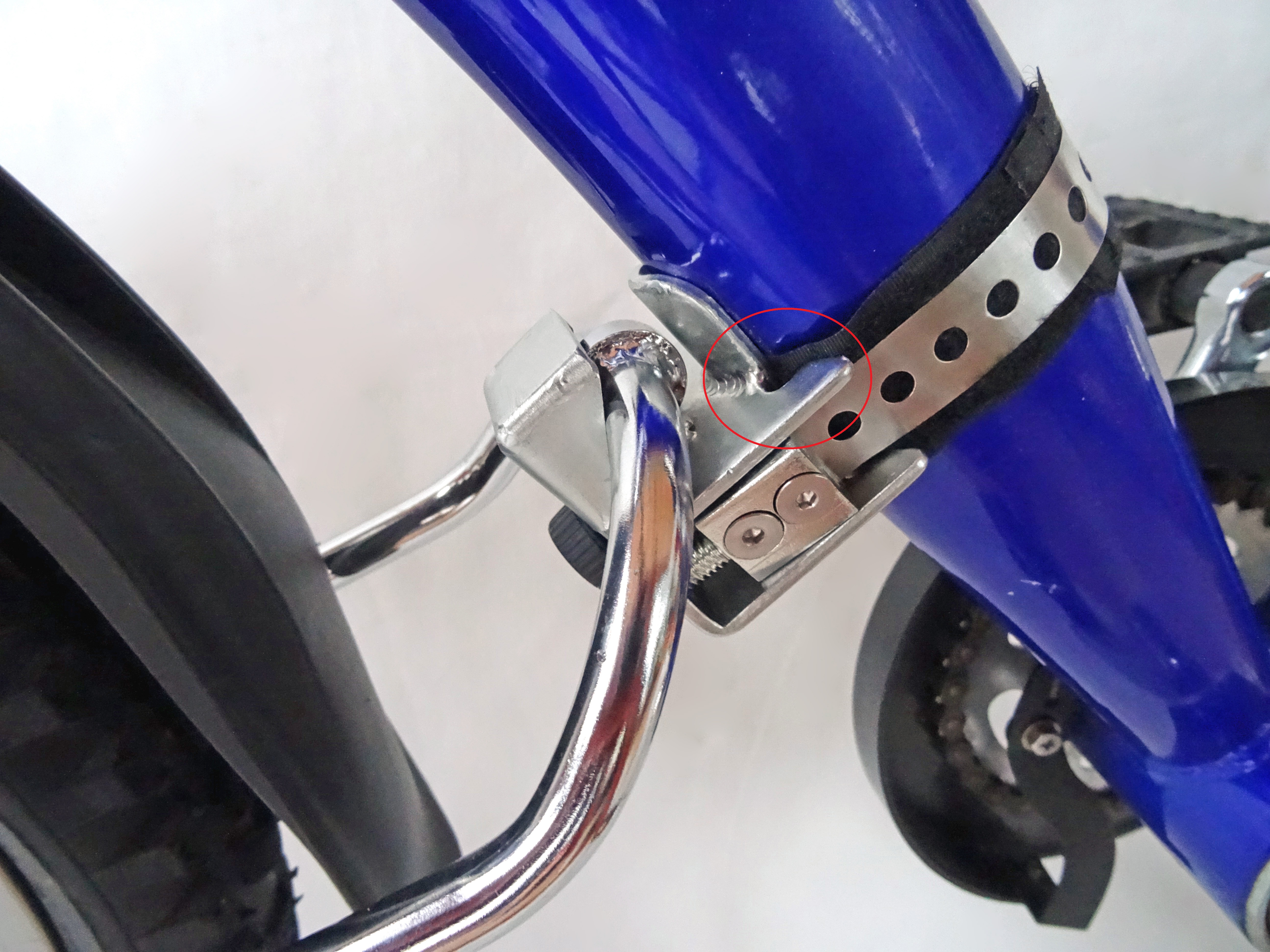 Le bloc de fixation à installer sur le cadre du vélo enfant présente deux « ouvertures » (encoches) afin de permettre le passage de câble de frein et/ou câble de commande de dérailleur.